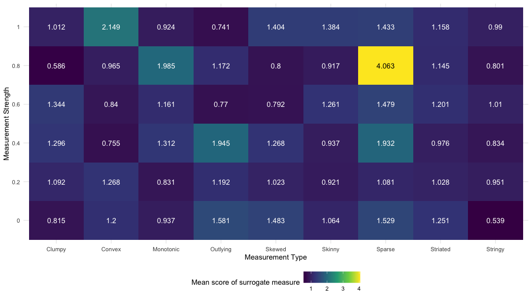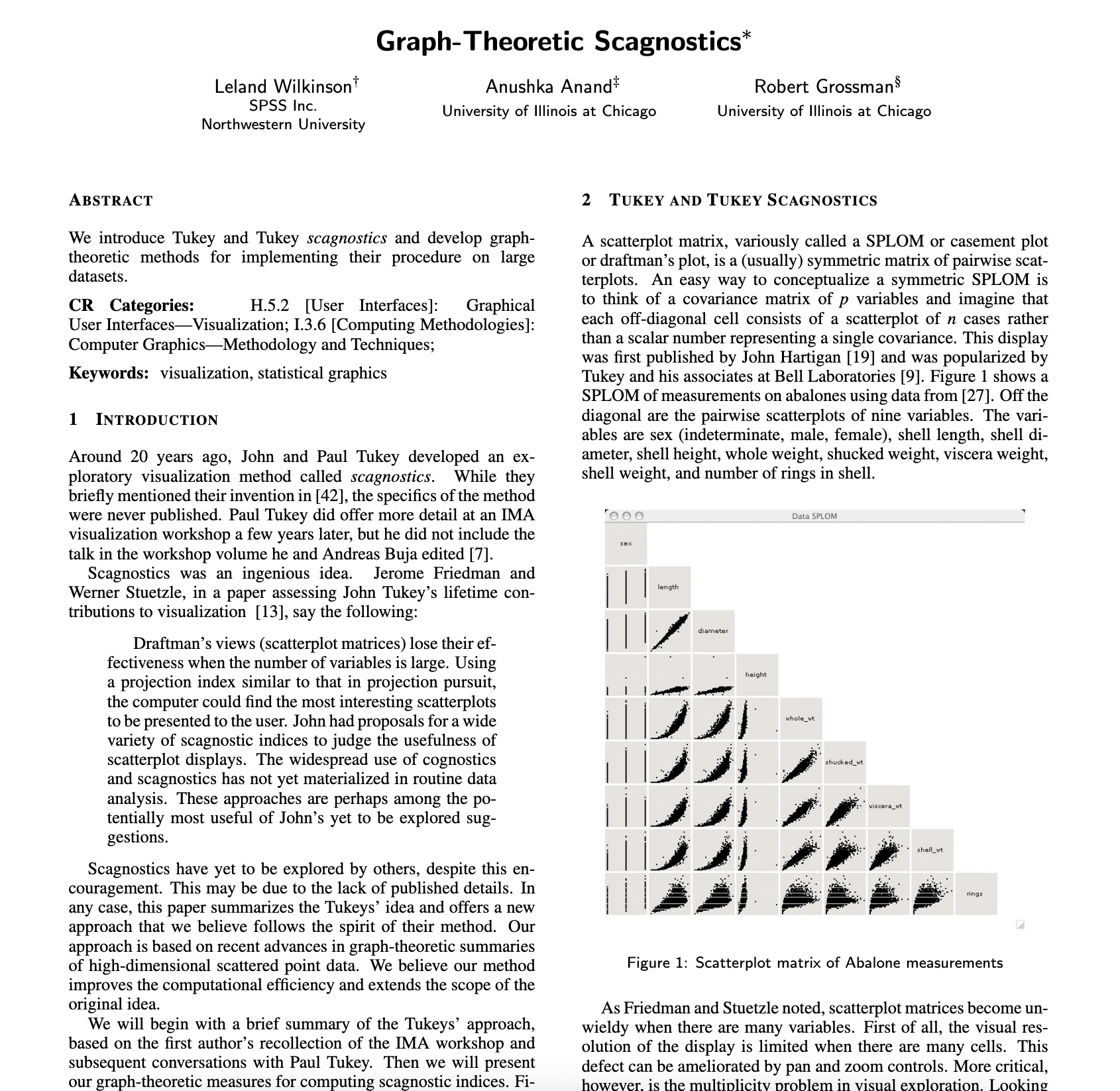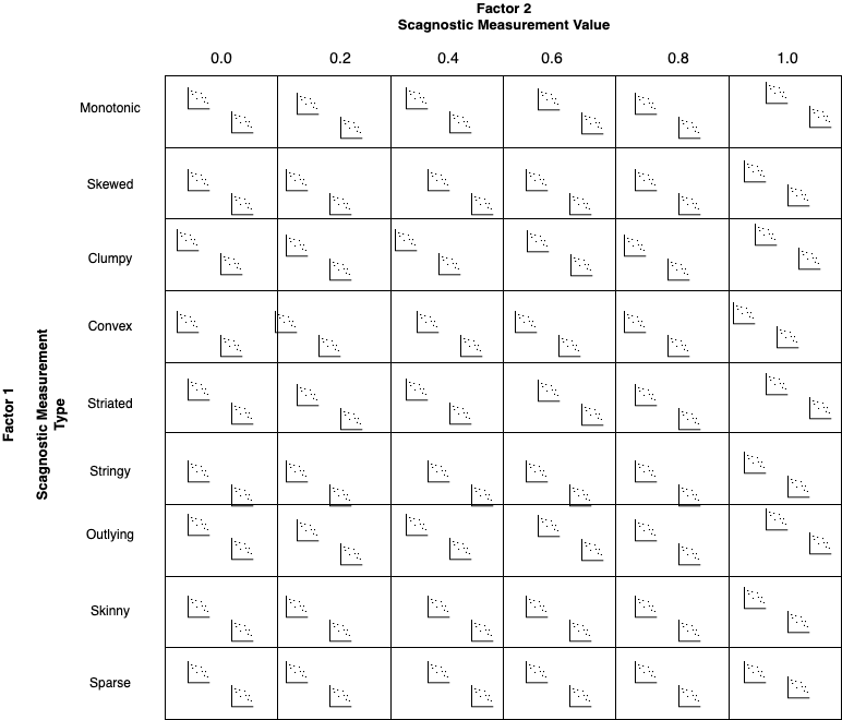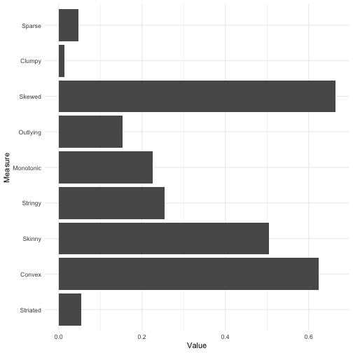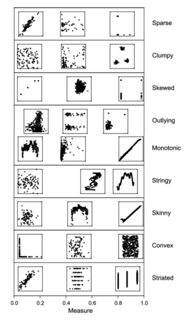 The late Leland Wilkinson developed graph theory based scagnostics that quantifies the features of a scatterplot into measurements ranging from 0 to 1