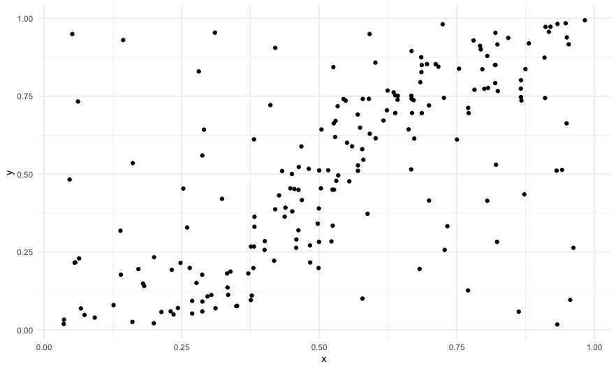 library(scatteR)library(tidyverse)df <- scatteR(measurements = c("Monotonic" = 0.9),n_points = 200,error_var = 9)qplot(data=df,x=x,y=y)