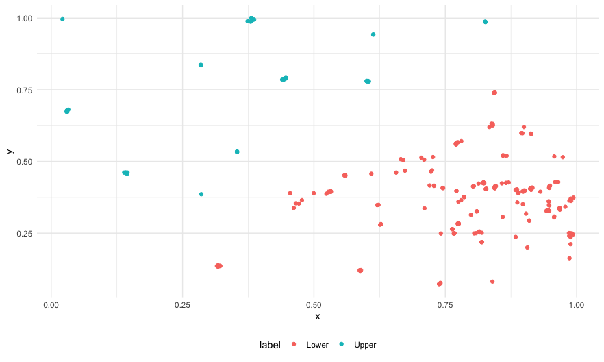 scatteR(c("Convex" = 0.9),n_points = 250,verbose=FALSE) %>% # data generation mutate(label = ifelse(y > x,"Upper","Lower")) %>% # data preprocessing ggplot(aes(x = x,y = y,color=label))+ geom_point()+ theme_minimal()+ theme(legend.position = "bottom")
